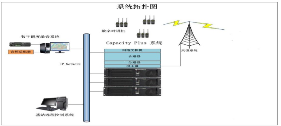 ?Capacity Plus多信道數(shù)字無線集群通信系統(tǒng)由數(shù)字基站、數(shù)字對(duì)講終端、數(shù)字調(diào)度錄