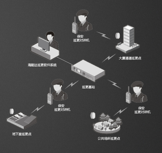 方案特點:部署方便,減少通信盲區(qū)。通過配備巡更基站,解決信號覆蓋問題,并統(tǒng)控制巡更對講機上傳的巡更數(shù)據(jù)。