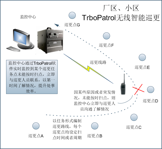 TrboPatrol--“智能對(duì)講巡檢系統(tǒng)”在摩托羅拉MOTOTRBO?系列對(duì)講機(jī)中融合了較新的無(wú)線巡檢技術(shù),巡檢員出門(mén)巡檢只需攜帶部摩托羅拉對(duì)講機(jī),即可方便的記錄下工作人員到達(dá)巡查點(diǎn)的時(shí)間及狀態(tài)信息,并通過(guò)計(jì)算機(jī)巡查情況分析,制定巡查計(jì)劃、排班管理等,同時(shí)又能通過(guò)對(duì)講機(jī)上報(bào)、處理在巡檢過(guò)程中發(fā)現(xiàn)問(wèn)題,保證時(shí)效性,減少安全事故,從而達(dá)到事半功倍的效果。