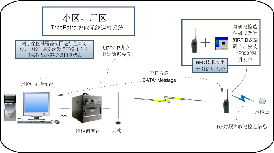 無線對(duì)講系統(tǒng)中,TrboPatrol系統(tǒng)由管理指揮中心、巡檢對(duì)講機(jī)以及巡檢點(diǎn)(鈕)等設(shè)備組成。系統(tǒng)示意圖如下圖所示。