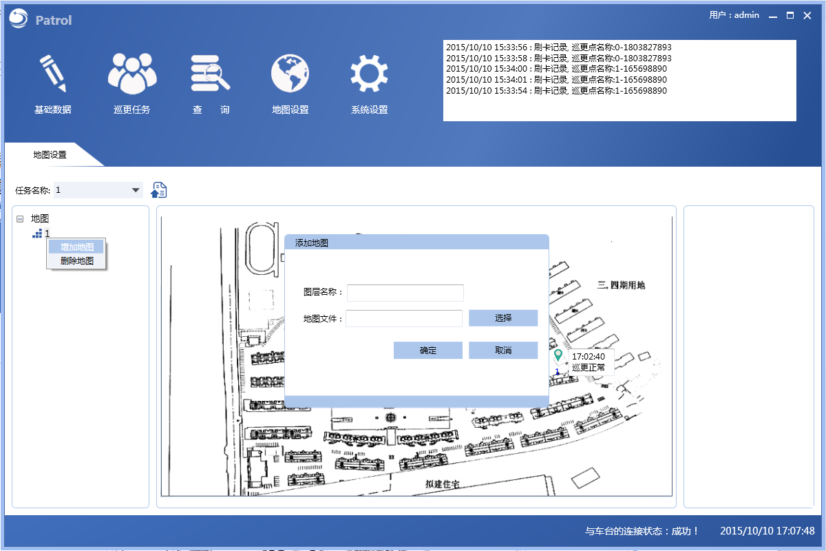 管理人員首先要進(jìn)行巡檢地圖的編制。從背景圖導(dǎo)入自制地圖并指定巡檢地點(diǎn)的編號(hào)和名稱,可按需增刪巡檢點(diǎn),巡檢點(diǎn)位置可自行拖拽至地圖上任何地點(diǎn)。