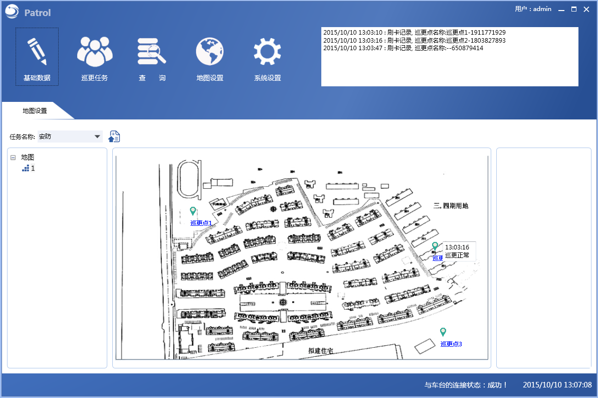 軟件左側(cè)會(huì)出現(xiàn)所有已添加的巡檢點(diǎn),在軟件右側(cè)根據(jù)需要自行設(shè)定巡檢路線以及時(shí)間等信息,接受任務(wù)的巡邏人員手持巡檢對(duì)講機(jī),根據(jù)預(yù)先編制的巡檢計(jì)劃來執(zhí)行。對(duì)講機(jī)仍然可以常規(guī)的通話對(duì)講使用。將巡檢對(duì)講機(jī)靠近巡視點(diǎn)(通常安裝在墻壁上),系統(tǒng)就可獲得當(dāng)前巡邏人員的位置。