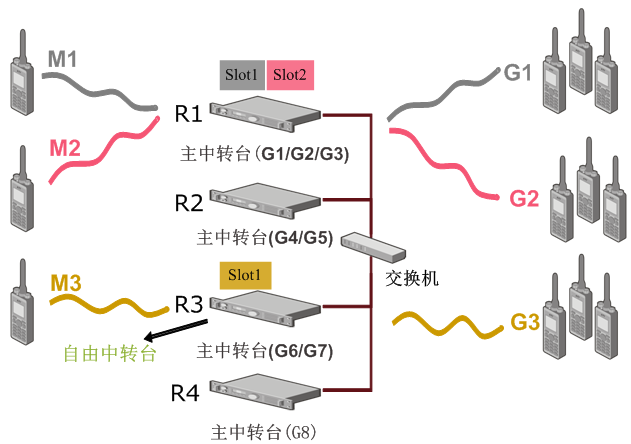 上圖中,假設(shè)對(duì)講機(jī)M1、M2和M3分別是用戶組G1、G2和G3的成員,中轉(zhuǎn)臺(tái)R1是M1、M2、M3的主中轉(zhuǎn)臺(tái),而G1、G2和G3是R1的歸屬組。M1和M2分別通過(guò)R1的時(shí)隙1和時(shí)隙2呼叫G1和G2,即上圖中的灰線和紅線。R1從空閑狀態(tài)切換到繁忙狀態(tài),而R3被指定為自由中轉(zhuǎn)臺(tái)。M3發(fā)起組呼呼叫G3,即上圖的橙線。由于M3的主中轉(zhuǎn)臺(tái)R1繁忙,呼叫只能通過(guò)自由中轉(zhuǎn)臺(tái)發(fā)起,于是M3切換到R3對(duì)應(yīng)的信道,然后再發(fā)起呼叫。這既減少了對(duì)講機(jī)接入系統(tǒng)所需的等待時(shí)間,也可以在保證定業(yè)務(wù)質(zhì)量的前提下較大限度地?cái)U(kuò)展通信容量。此外,在同時(shí)刻所有邏輯信道被同時(shí)占用的概率很低,因此,在XPT系統(tǒng)下,呼叫被拒的概率將遠(yuǎn)低于僅有個(gè)常規(guī)信道可供接入的情況,可以幫助同個(gè)系統(tǒng)下的用戶盡可能快速高效地進(jìn)行語(yǔ)音通信和數(shù)據(jù)通信。