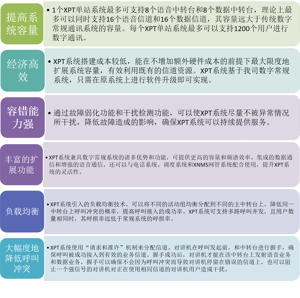 在無(wú)線對(duì)講系統(tǒng)中,XPT(Extended Pseudo Trunk,增強(qiáng)型虛擬集群系統(tǒng))是基于海能達(dá)自有的XPT協(xié)議開發(fā)的分布式集群系統(tǒng)。在個(gè)信道繁忙的情況下,XPT系統(tǒng)中的對(duì)講機(jī)用戶可以共享站內(nèi)的其他空閑信道,并使用這些信道進(jìn)行通信,而不是固定工作在某個(gè)信道。在不增加硬件投入成本的前提下較大限度地?cái)U(kuò)展系統(tǒng)容量,有效地利用既有的信道資源,滿足中低端集群客戶的需求。