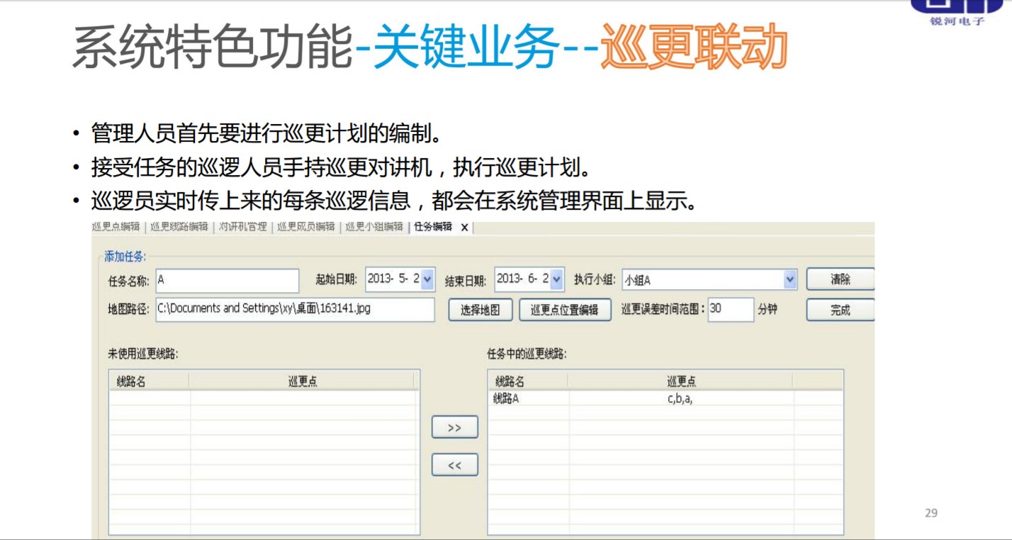 巡更聯(lián)動(dòng) :管理人員首先要進(jìn)行巡更計(jì)劃的編制接受任務(wù)的巡邏人員手持巡更對(duì)講機(jī),執(zhí)行巡更計(jì)劃。