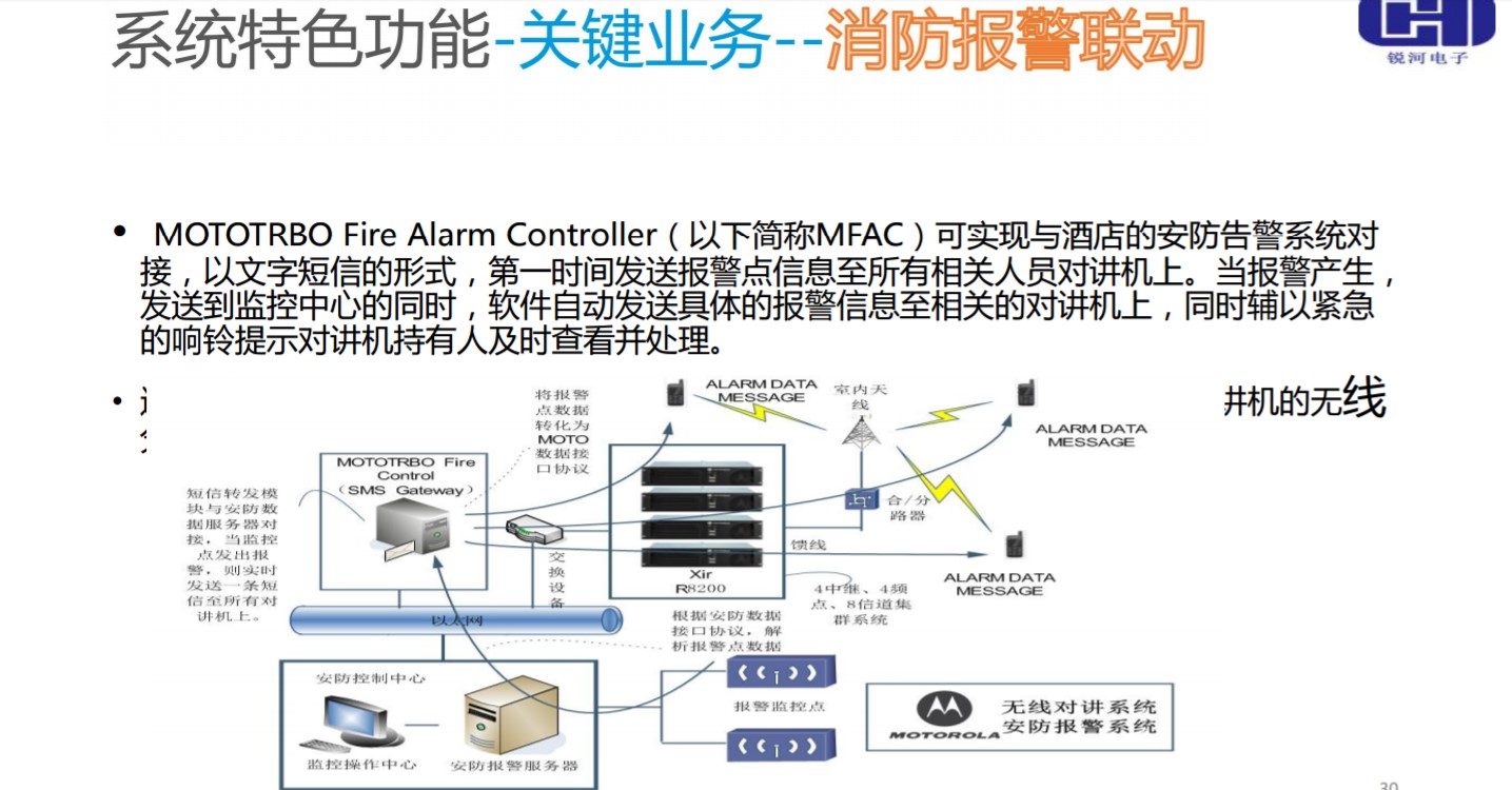 消防報(bào)警聯(lián)動(dòng):MOTOTRBO Fire Alarm Controller(以下簡(jiǎn)稱MFAC)可實(shí)現(xiàn)與酒店的安防告警系統(tǒng)對(duì)接,以文字短信的形式,第時(shí)間發(fā)送報(bào)警點(diǎn)信息至所有相關(guān)人員對(duì)講機(jī)上。