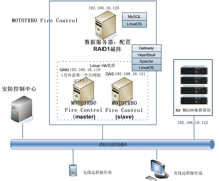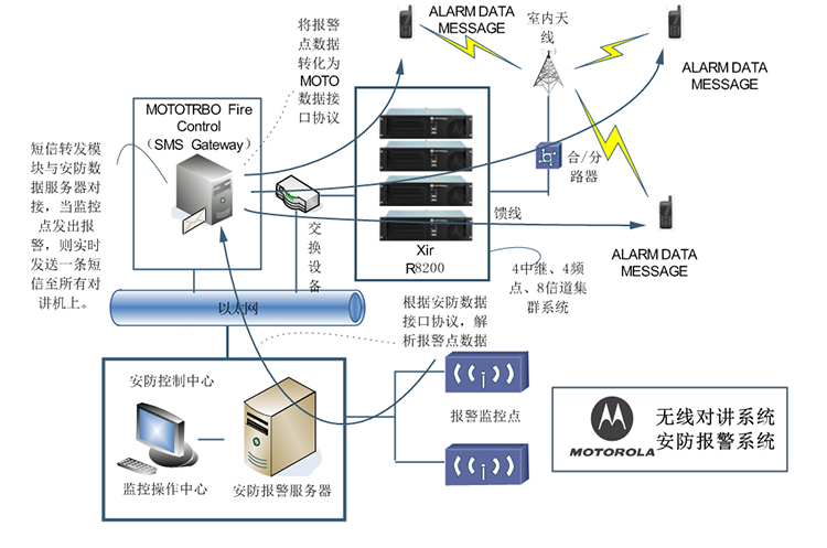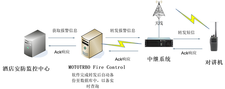 通過酒店內(nèi)部網(wǎng)絡(luò)連接至中繼臺(tái),前端對(duì)接至安防控制中心系統(tǒng),后端通過對(duì)講機(jī)的無線分布覆蓋,實(shí)現(xiàn)報(bào)警信息發(fā)送至對(duì)講機(jī)。