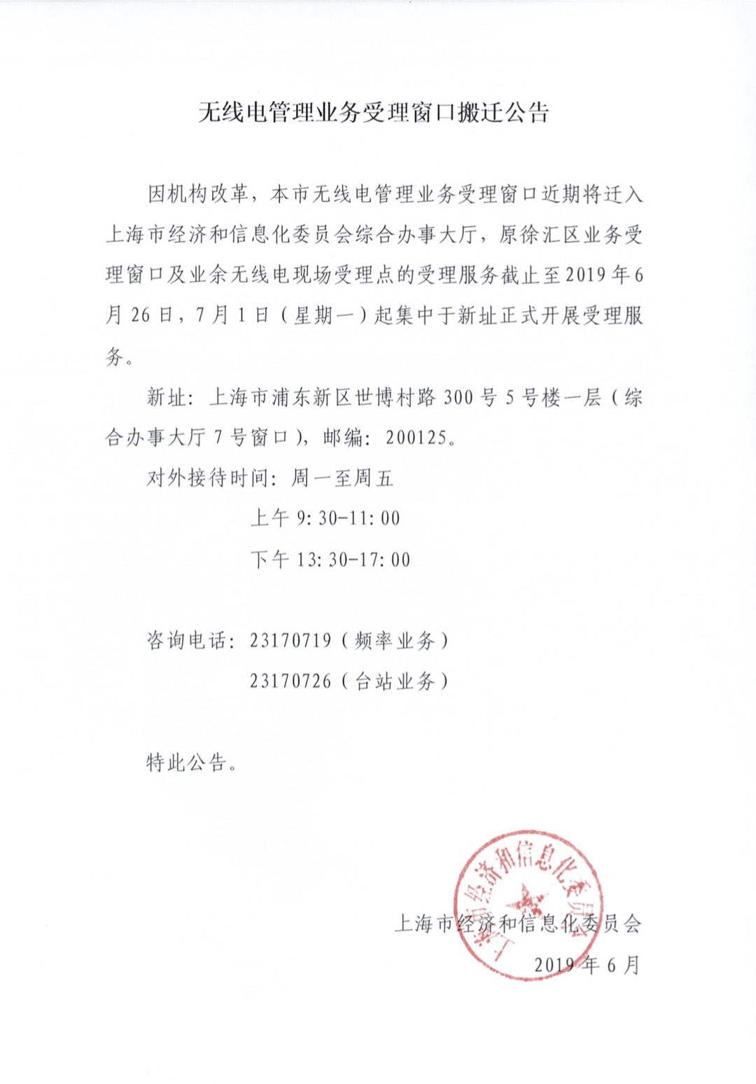 原徐匯區(qū)業(yè)務受理窗口及業(yè)余無線電現(xiàn)場受理點的受理服務截止至2019年6月26日,7月1日(星期)起集中于新址正式開展受理服務。